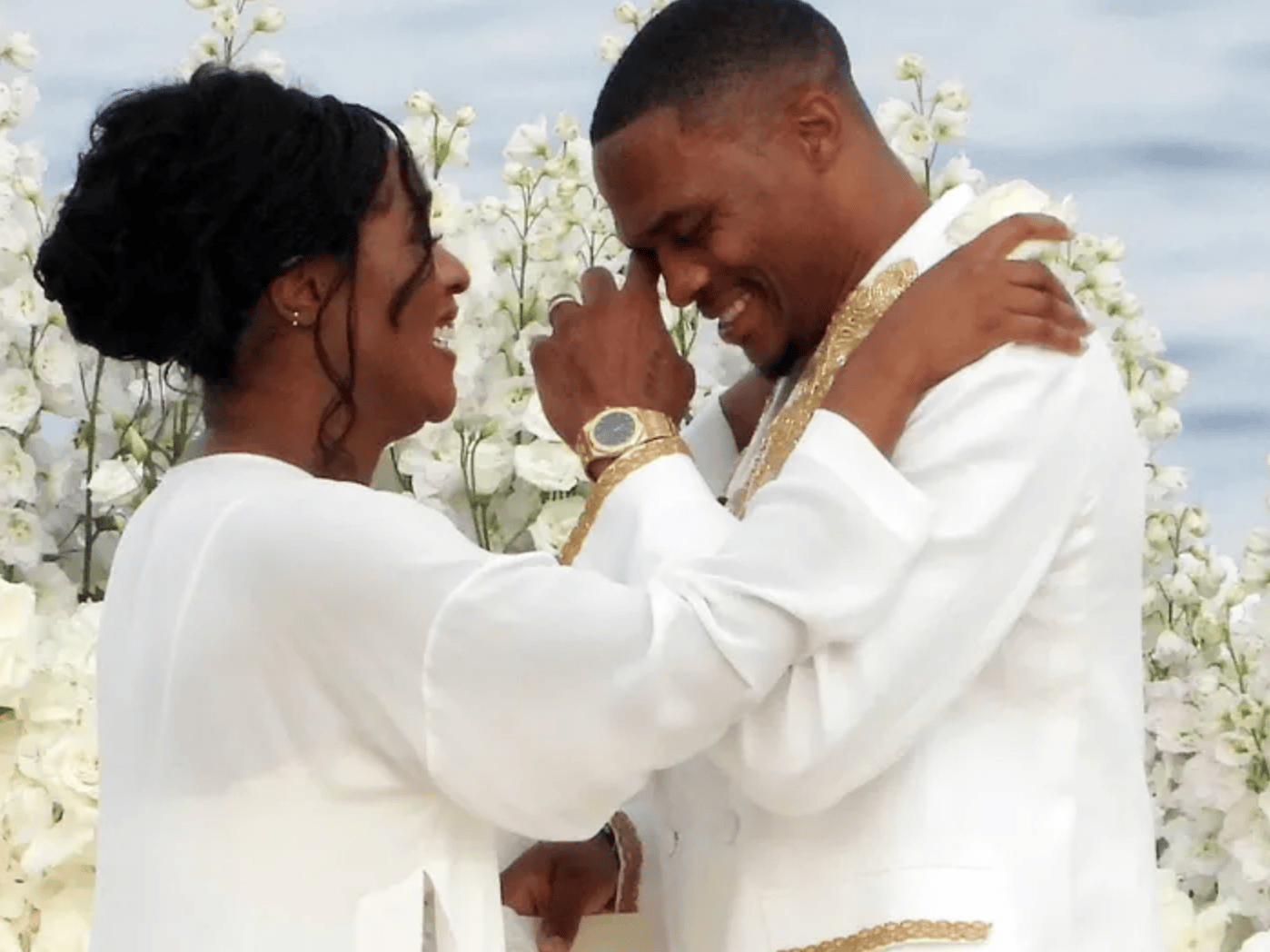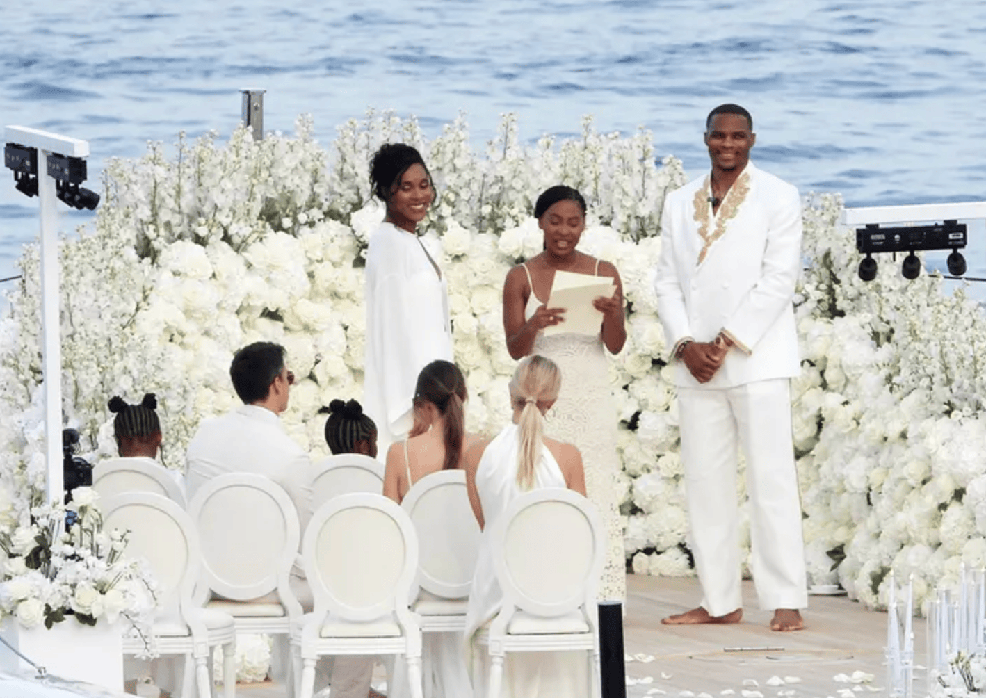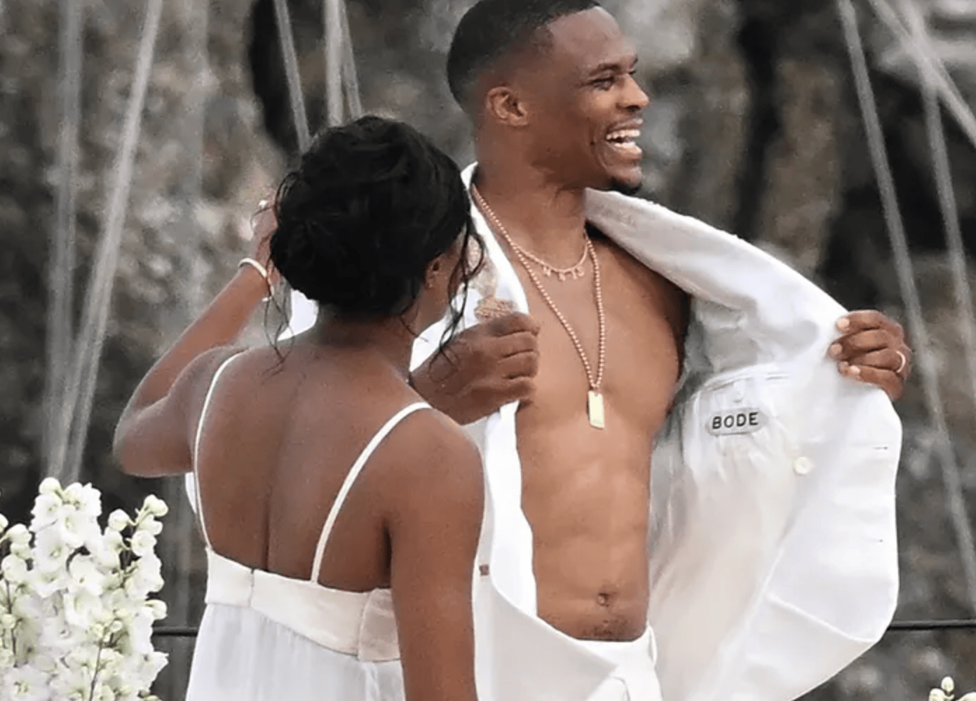 TMZ表示,威少和妮娜为这次活动都穿上了华丽的白色礼服,妮娜还戴着一枚钻戒。他们的一些亲密朋友和家人也都在场,同时还有一些弦乐音乐家。仪式现场有大量的花朵和水景成为他们倾诉心声的完美背景,整个场景宛如童话,现场威少还动情地留下了泪水。